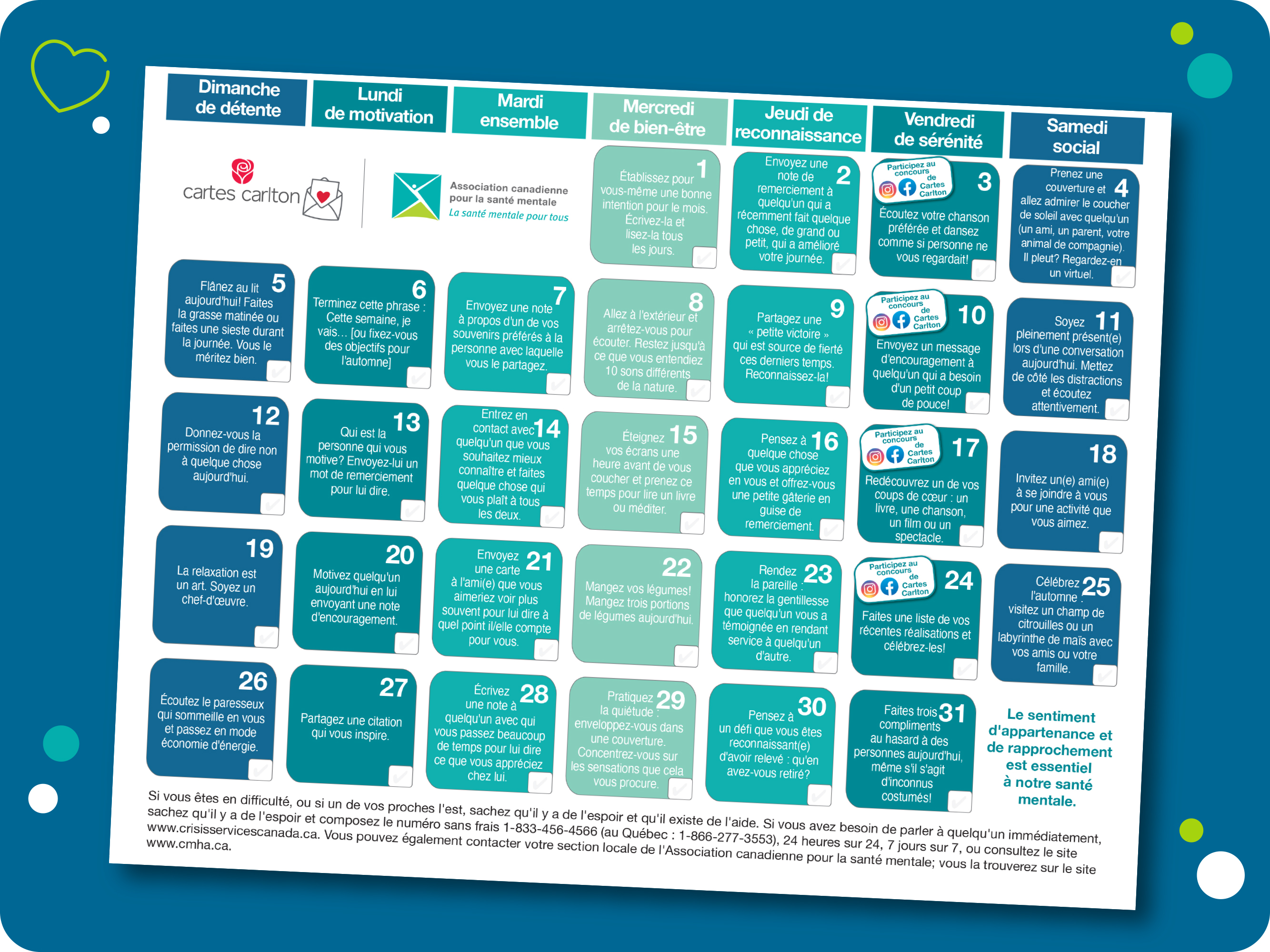 Depuis 2021, nous sommes associés à canadienne pour la santé mentale (ACSM) dans le cadre d'une campagne annuelle visant à sensibiliser le public au pouvoir des liens humains dans le soutien du bien-être mental. Nous sommes fiers que les cartes de souhaits puissent jouer un rôle dans ces liens. Le succès de la campagne a été rendu possible grâce au soutien de nos nombreux partenaires commerciaux nationaux, qui se sont joints à nous pour la promouvoir dans leurs magasins.